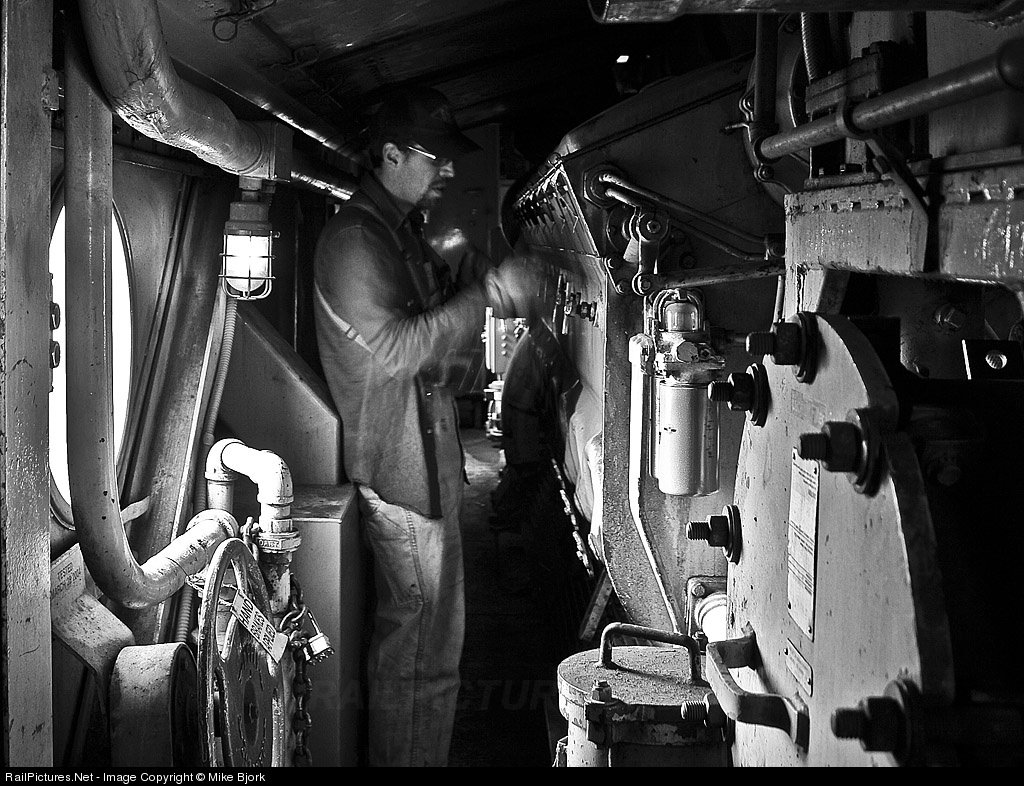 Working inside the heart of a magical machine. Not too often does any railroader get a chance to work fully inside an enclosed locomotive. Let alone an F unit. The covered wagons are a thing of yesteryear, in favor of walkways and big service shops. But out on the shortline, things are always a little different. No big service shops. No long walkways. And a big F. At times, the mechanic doubles as a conductor, the engineer doubles as an office clerk, and even the president gets his hands dirty as he doubles as a mechanic. Working on a lazy Saturday, Stan opens the blow valves, checks the oil levels, and readies the F-units rebuilt EMD 567 prime mover for its symphony.