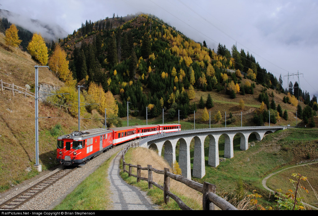 Autumn colours in the alps as former Brig-Visp-Zermatt Bahn No 22 'St Niklaus' crosses the Bugnei viaduct with a local train on the former Furka Oberalp Bahn from Desentis to Brig. This was the only train the sun shone for on an otherwise cloudy day.