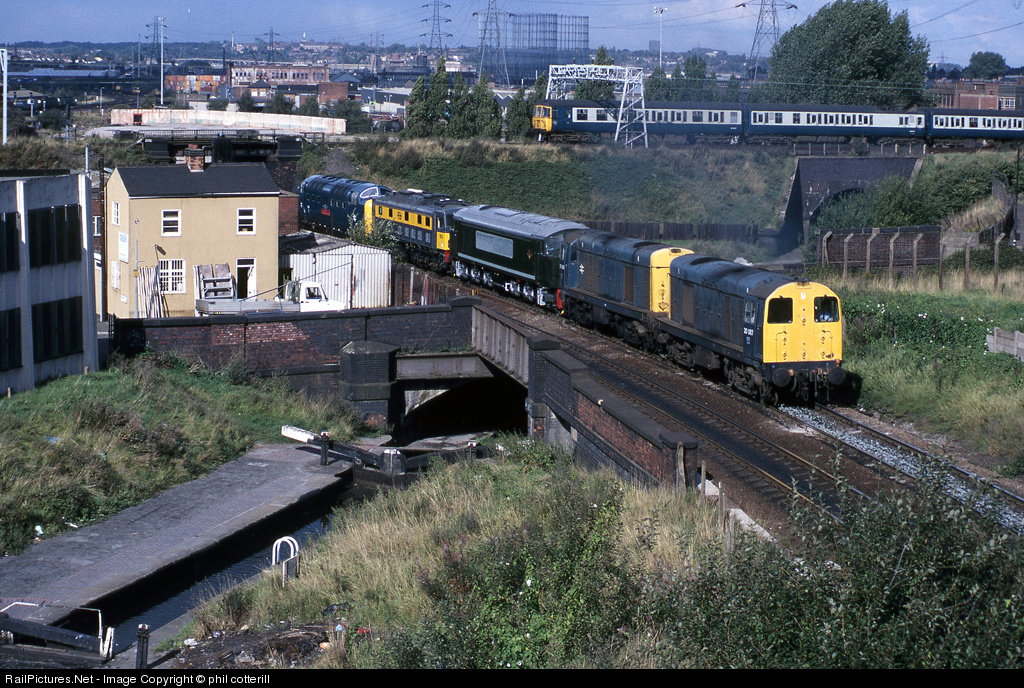 | 20087 and 20060 tow 3 preserved locos to Basingstoke rail week (a railfan event). The locos are D100 (class 45), 1502 (UK class 77 and Dutch class 15) and 55019 (Deltic).The class 20s did not attend the event! A class 310 EMU passes above on a Birmingham New St to Coventry local service. |