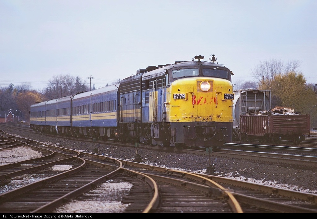| VIA 74 with an FPA-4 and F9B is arriving at Brantford to drop off and pick up passengers. After a quick 3 minute stop VIA 6779 - VIA 6636 will depart heading towards Toronto with it's train of 4 coaches, a galley car and another coach. |