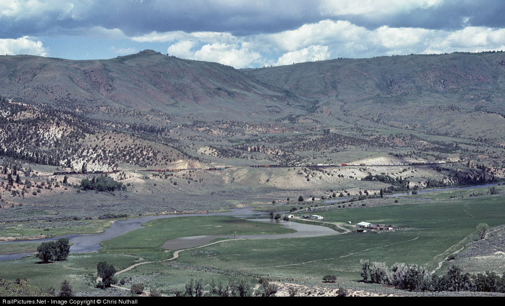 Crossing open country alongside the Colorado River, between Gore and Little Gore Canyons, 3100, 3082, 3093 and 3091 and their westbound freight have just run through Azure siding in June 1981.