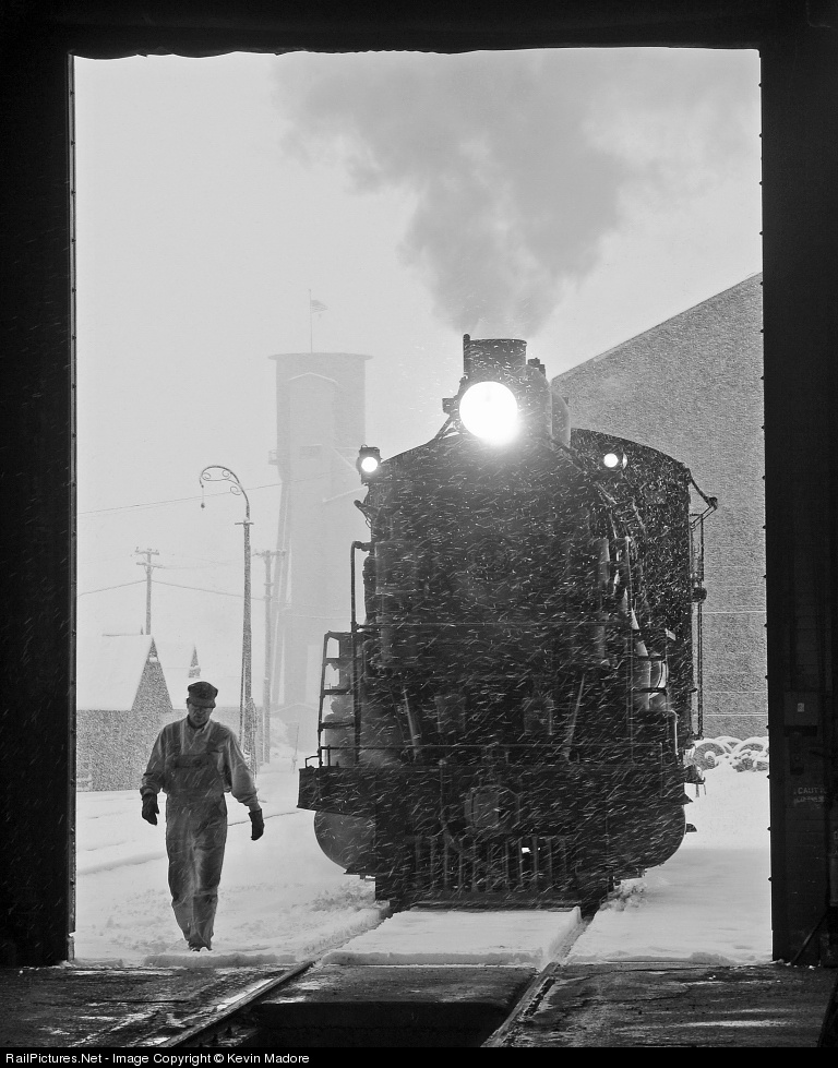 | Shelter from the storm is finally within reach, as a Nevada Northern Fireman enters the East Ely Engine House to marshall his locomotive into its stall for the night. |