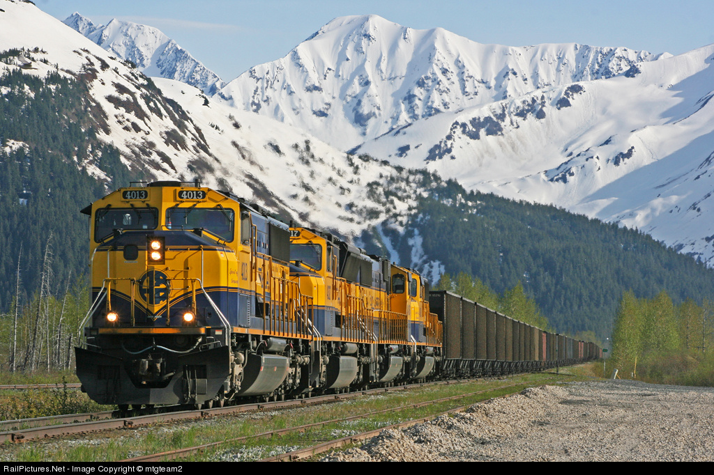 On a beautiful first day in Alaska 2009 a northbound coal empty is at milepost 64, Portage, Alaska. Lead MAC 4013 is from the Alaska RRs first order while 4317 is from the second order. The most notable difference is the flared radiators on the 4317. To the left of the locomotive is the south end of the wye that starts the branch to Whittier.