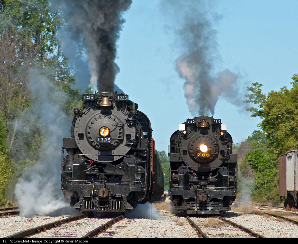Big Berk, Little Berk? Your eyes play tricks with your mind in this down-the-throat tele-smash of the world's two remaining operable Berkshire Locomotives. The PM 1225 appears for all the world to be larger in every dimension than sister locomotive NKP 765, although the two are actually almost identical in design. In this shot, the 765 rides on a track that is slightly lower in elevation, and she's nearly a full chassis length behind the 1225. The long telephoto compresses the depth-of-field and the resulting picture is pretty darn convincing!