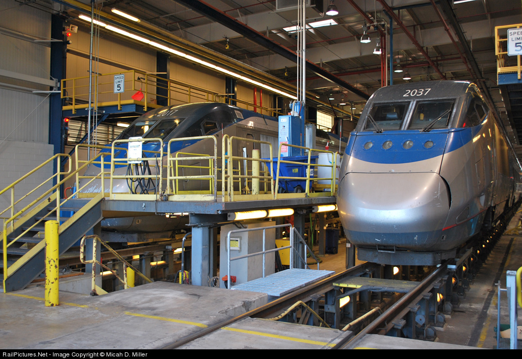 | Two Acela sets in Amtrak's Southampton Street facility for inspection and cleaning. Amtrak provided our group with a trackside tour followed by a run through the set including the cabs and power cars. |