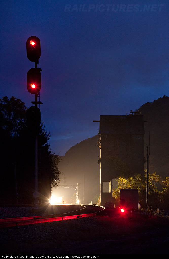 A westbound grain train illuminates the H828 Quinnemont local which is waiting to clear up off the Loup Creek branch. Thurmond is an eerie, yet magical place that when busy is extremely entertaining... when quiet it's rather spooky. Especially at night!