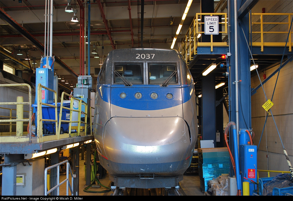 | An Acela trainset led by power car 2037 sits quiet on a Sunday for a cleaning and inspection before going out on the Monday morning rush. A group of railfans was granted special access and a tour of this part of the Southampton Street Yard, Amtrak's High-Speed Rail facility. |