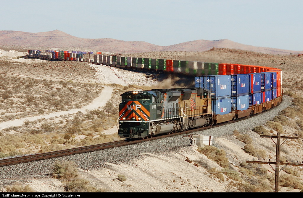 | This train, lead by UP's Western Pacific Heritage Unit is seen here leading this double stack through the "S" curve at Jean, NV |