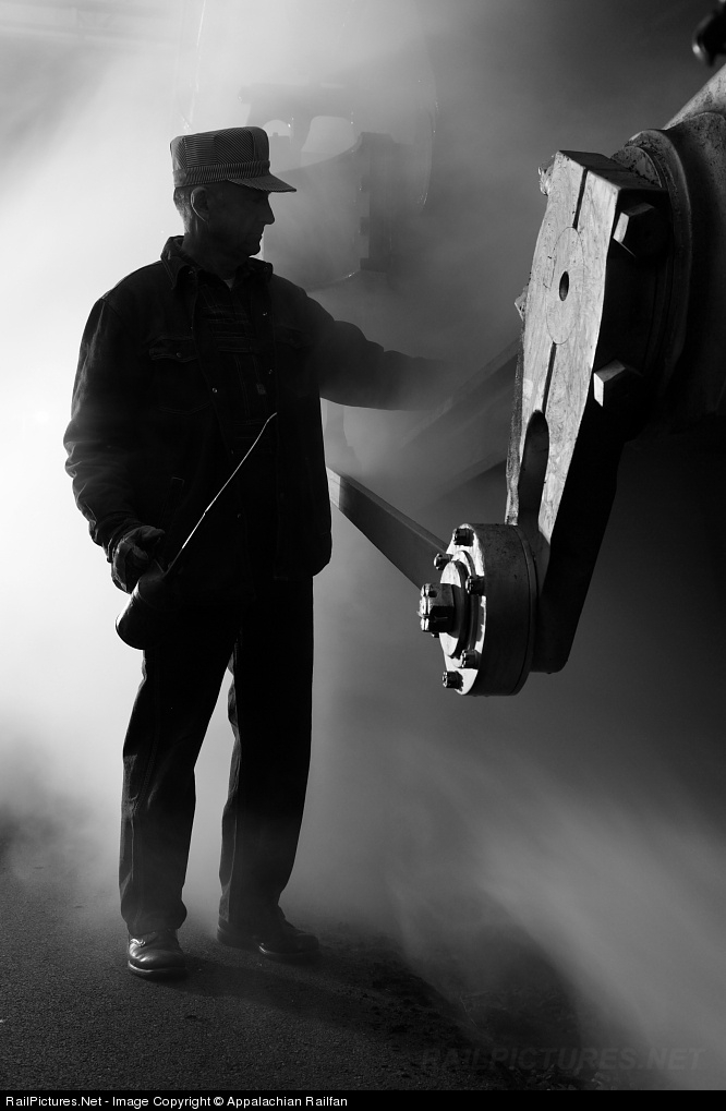The engineer is checking the rods and bearings on a pre-departure inspection before leaving Roanoke. Special thanks goes to Lerro Productions and the Virginia Museum of Transportation for allowing this photographic opportunity.
