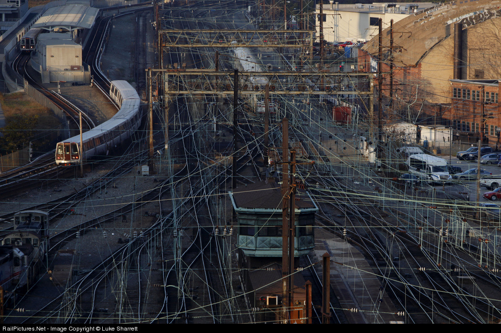 A Red Line Metro bound for Glenmont navigates a curve toward the New York Avenue station beside the Union Station yard.