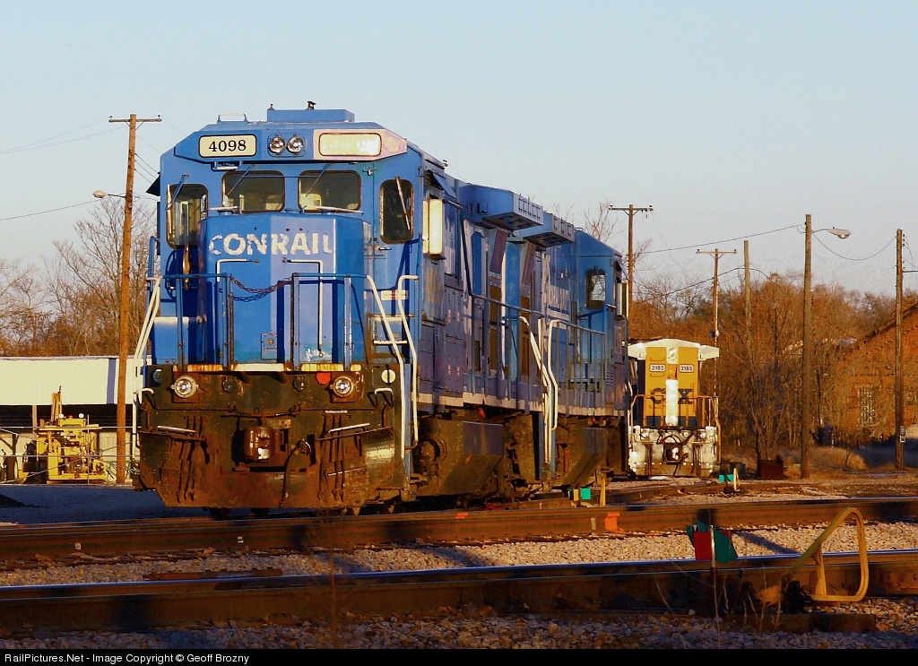 | Three Super 7's sit in the Newark Yard in the late evening light, two in CR paint, the other one in CSX paint. |