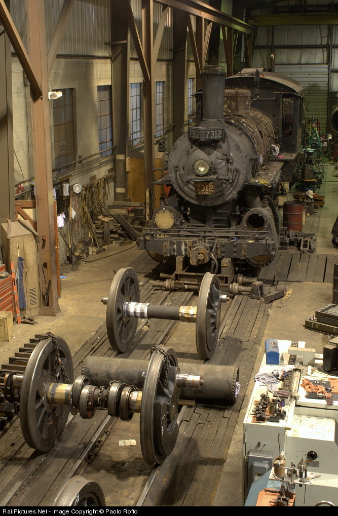 | 7312 rests in the shop, torn down for extensive running gear work, with her drivers just ahead of her. Better be careful when taking the shop tour - those driving wheels are very well-balanced and roll quite easily. |
