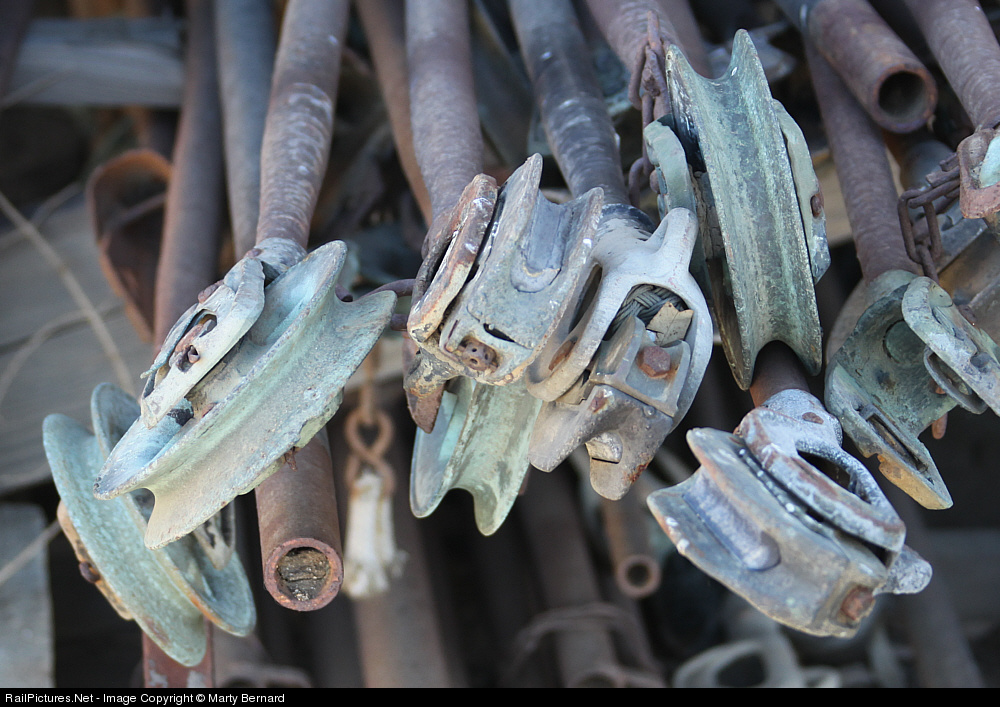 This is some of the Orange Empire Railway Museum's spare trolley poles. Some poles have wheels and some have sliding carbon trolley shoes. The carbon inserts in the shoe in the center and the shoe in the lower right are clearly visible. For a good explanation and history of trolley wheels and shoes see: http://en.wikipedia.org/wiki/Trolley_pole