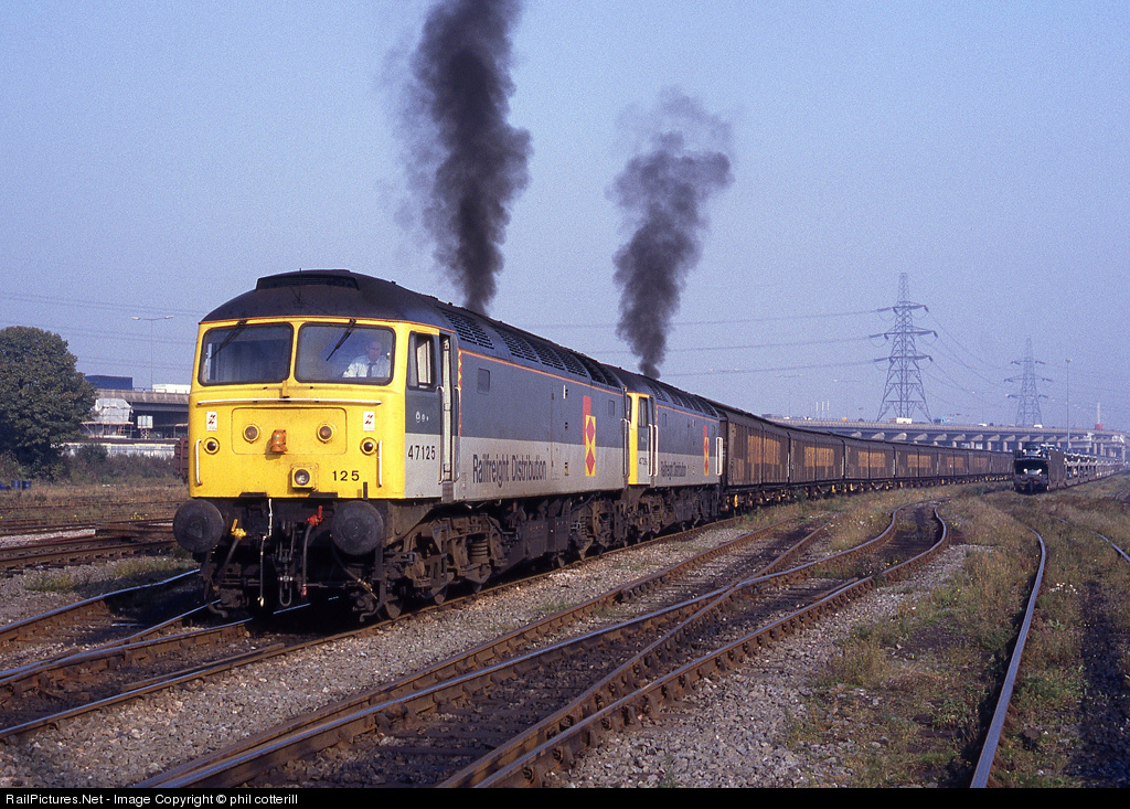 | RFD locos 47125+47290 climb out of washwood Heath yard with a train of auto body panels for the Rover car factory at Longbridge. These locos were fitted with multiple working late in their careers and it was very successful.