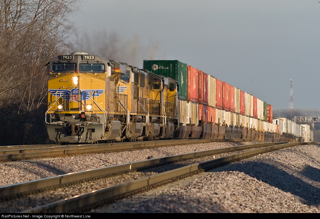 One does not often see four big units on a freight train in Illinois, but here is a nice exception. UP 7923 is on the point of an intermodal coming up out of the Fox River Valley.