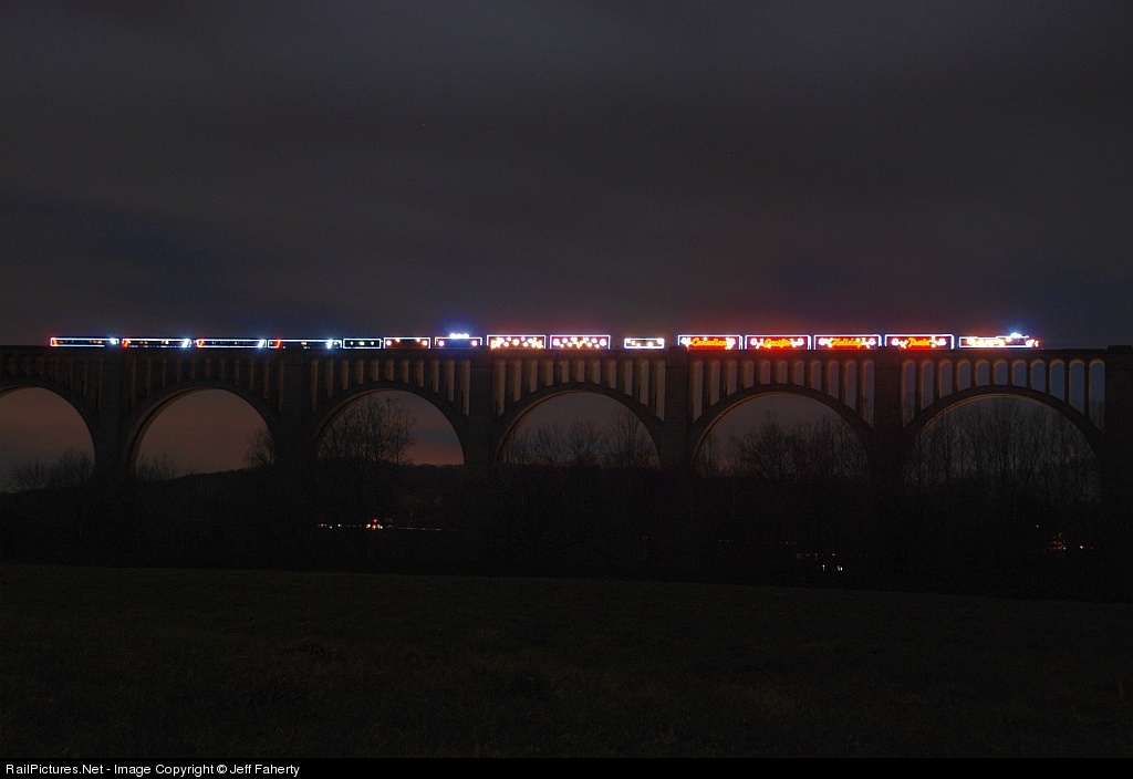 The Canadian Pacific Holiday Train stops momentarily on top of the impressive Tunkhannock Viaduct to please the crowds below.