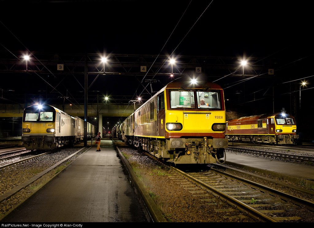 | Due to the congested nature of passenger traffic in Southern England most freight trains between continetal Europe and England run at night. Here the shunter is on the radio to the control office to advise that trains are ready to go. |