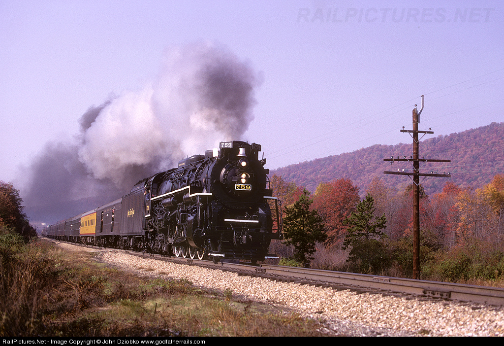 | Somewhere in Virginia on the N&W, the NKP 759 has it's train hustling down the road. This was a Roanoke to Shenandoah roundtrip. Know the location? |