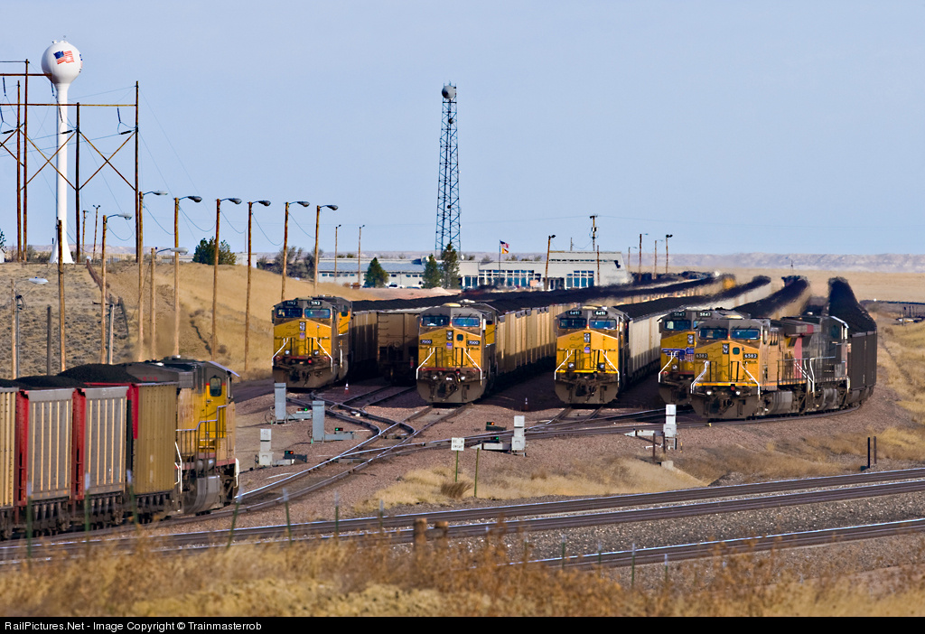 | Its a quiet day at UP's Bill terminal as a whole slew of UP trains wait their crews. UP was slow this day in the PRB on account of a loaded OMAX train derailing 39 of its cars on UP's Overland Route at Overton, Nebraska. |