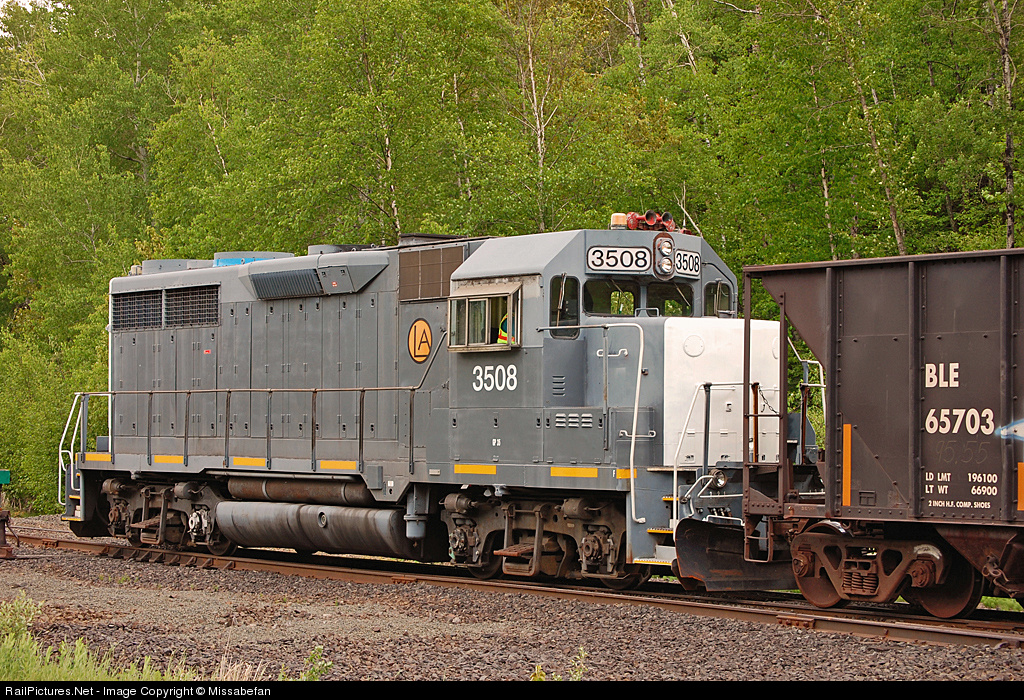 | The two man crew of Laurentian Aggregates uses this former Southern Pacific GP35 to spot cars for loading blast furnace trim or RR ballast made from crushing waste taconite rock on United Taconite property. The loaded cars are then set out for pick-up by CN (former Missabe) and brought to either the Two Harbors, MN dock or the dock at Duluth, MN for ship loading. |