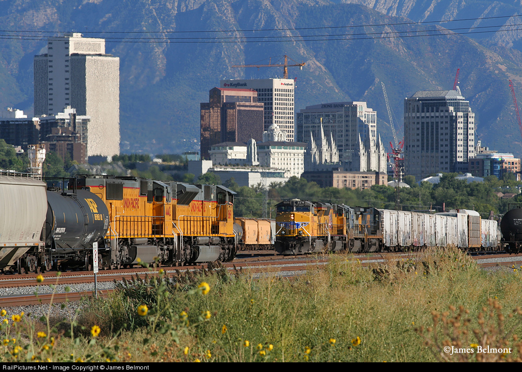 | Union Pacific's North Platte, NE to West Colton, CA freight meets it's eastward counterpart at North Yard in downtown Salt Lake City, Utah. |