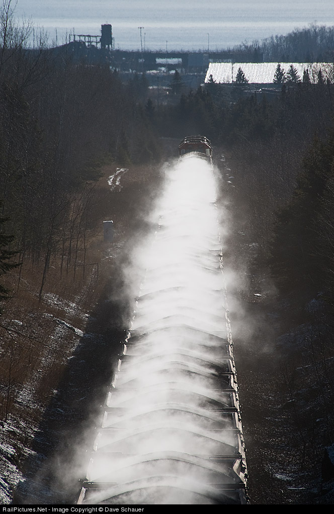 Steaming into port. Loaded ore train from Minntac eases down the 2.9% grade into Two Harbors, Minnesota. Temp was a mild +18F.