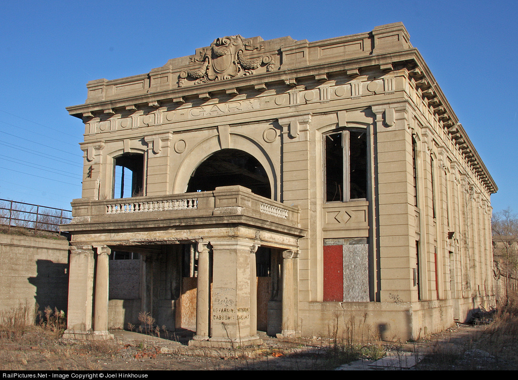 Built in 1910, over 100 years ago, Gary Union Station was designed by architect M. A. Lang as a two-level station between the Baltimore and Ohio (south, off screen to right) and the South Shore & Michigan Southern line, part of the New York Central System (north, visible at left), near the entrance to the U.S. Steel plant. It has been abandoned for over 50 years, yet the structure of the depot still appears to be in surprisingly good shape. Still, it sits forlornly by as over 100 trains per day (including perhaps a dozen Amtrak trains, none of which even so much as slow down) pass by on the NS to the left and CSX to the right, as well as EJ&E and South Shore Line each just yards away (see Google Satellite) >.