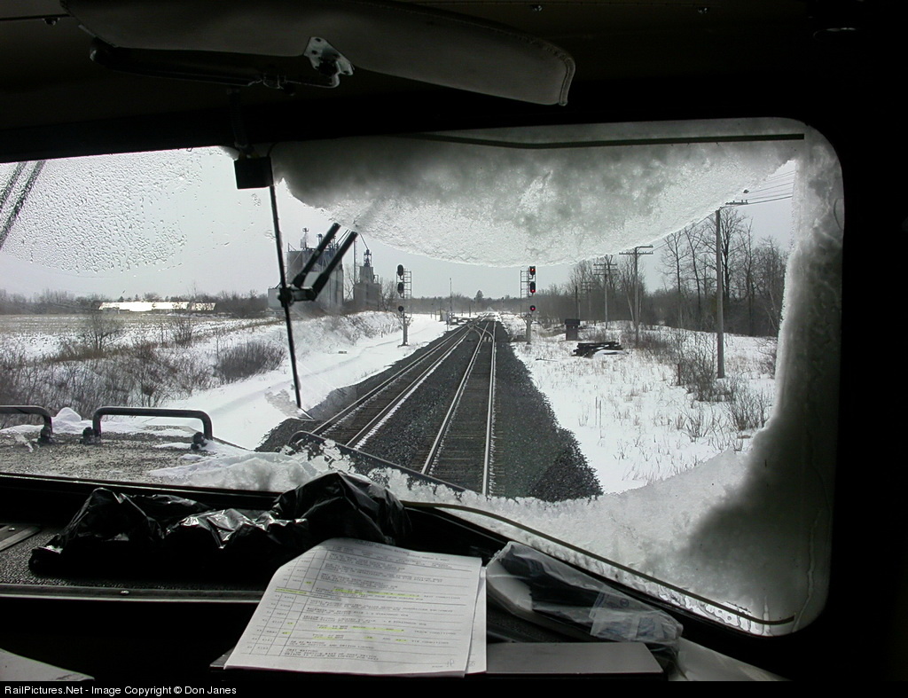 An engineer's view from the cab of CN 2683 on train 331 passing Komoka on a blustery March afternoon. This was the way I spent my birthday that year.
