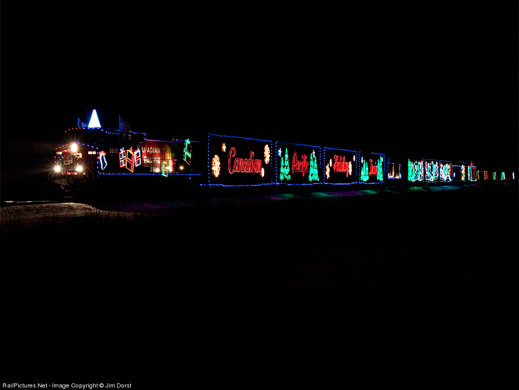 With no artificial light but its own, the CP Holiday Train approaches Golden Yard.
