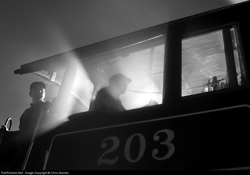 Evening hostlers Brent DeBusk and Jeff Parrott move 203 around the engine shed during a night test run prior to 203's busy operations on the Three Rivers Rambler Christmas trains.