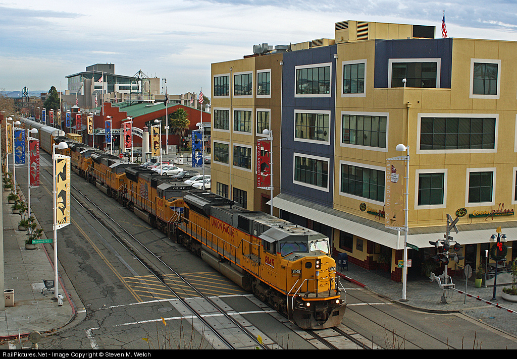 | Five! Five EMD's, four of which of the SD9043MAC model all face forward as they lead a 55-car empty auto train North towards Oakland, on the homestretch in Jack London Square. |