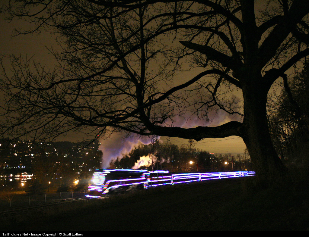 Southern Pacific steam locomotive no. 4449 pulling the Oregon Rail Heritage Foundation's Holiday Express train in Portland, Oregon, on December 11, 2009. The 4449 operated on December 11-13, while the SP&S no. 700 powered the trains on December 4-6. Proceeds from the trips will help fund a new, permanent home for the City of Portland's three steam locomotives. See another view on railroadheritage.org.