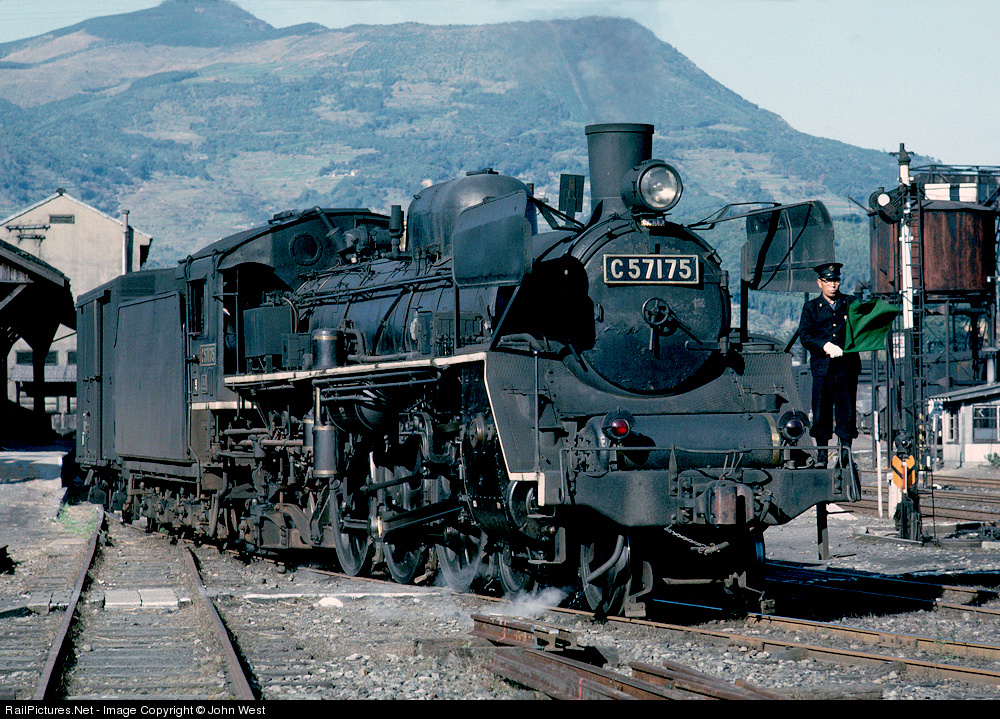 When the U. S. Navy arranged for me to make a brief visit to Sasebo, Japan, not only was I able to buy my first Nikon camera at the Navy Exchange, but I was surprised to find the JNR to be 100 percent steam in the area. These graceful little class C57 pacific's headed the frequent passenger service between Sasebo and Nagasaki. Here the C57175 switches in the yard at Haiki, the junction between the branch to Sasebo and the mainline to Nagasaki. While JNR was narrow gauge and steam powered here, in Tokyo they were already laying track for the new high speed "bullet" trains.