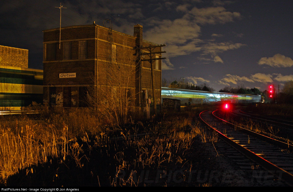 | The orginal wooden tower was replaced in the 1950's by a modern brick tower on the opposite side of the mainline. 59 years later and still standing an ONR passenger train rolls by and will drop off a GO bilevel at the west end of Mimico, passing the long ago boarded-up Canpa tower that once controlled movements off CP's Canpa Sub in the foreground. |