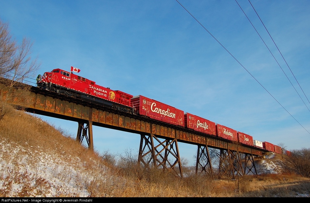 With plenty of time before its first stop at Elbow Lake, the CP holiday train takes its time as it glides over a rather impressive (for this area) structure.
