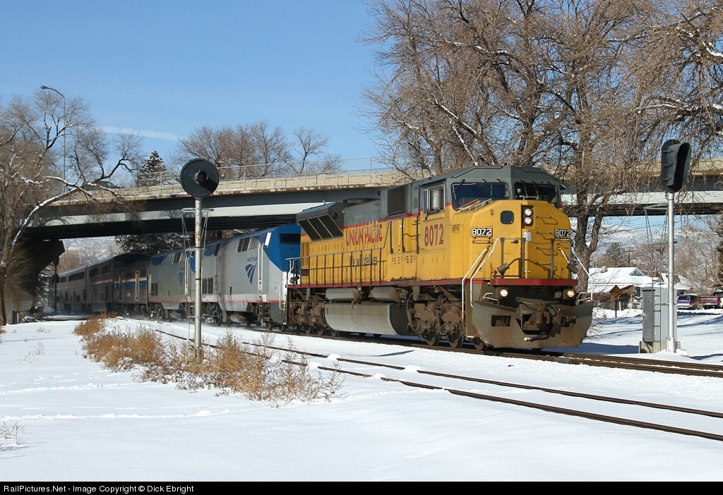When Amtrak #6 blew for the road crossing a mile or so west of Price, Utah, I knew something didn’t sound right. When it hove into view a minute or so later and came out from under the highway overpass I knew why. #6 was being led by UP 8072, an EMD SD9043AC. I have seen many UP freight engines leading Amtrak over the years, but never one of these big EMD AC units. The train was running about 4 hours late.