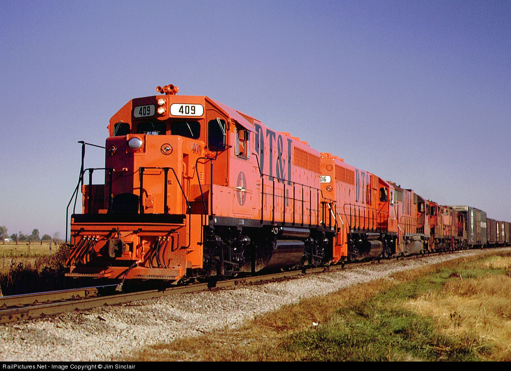 Less than a week old and pulling the DT&I's "hottest" train, our southward run to Springfield, Ohio was interrupted briefly for MofW work just north of Delta. Lucky for me, the sun and sky was perfect to capture this image of the entire consist while we waited. This was the first of many trips I made to Springfield back in the '70s, but this was the only trip that featured brand-new power. We left Flat Rock at 9:15 AM with units 409-406-209 (GP38-2) 956-957 (GP7s) and had 64 loads/32 empties/5680 tons. Units 956-957 were dead but we did have a message stating they could started and used if needed, but that wasn't necessary. The GP7s were making their final trip over the DT&I and enroute to Paducah, KY to become "Paducah rebuilds." If anyone would like to read more about my trip, please go to: http://dti.railfan.net/Signal_Maintainer/sig_main.html