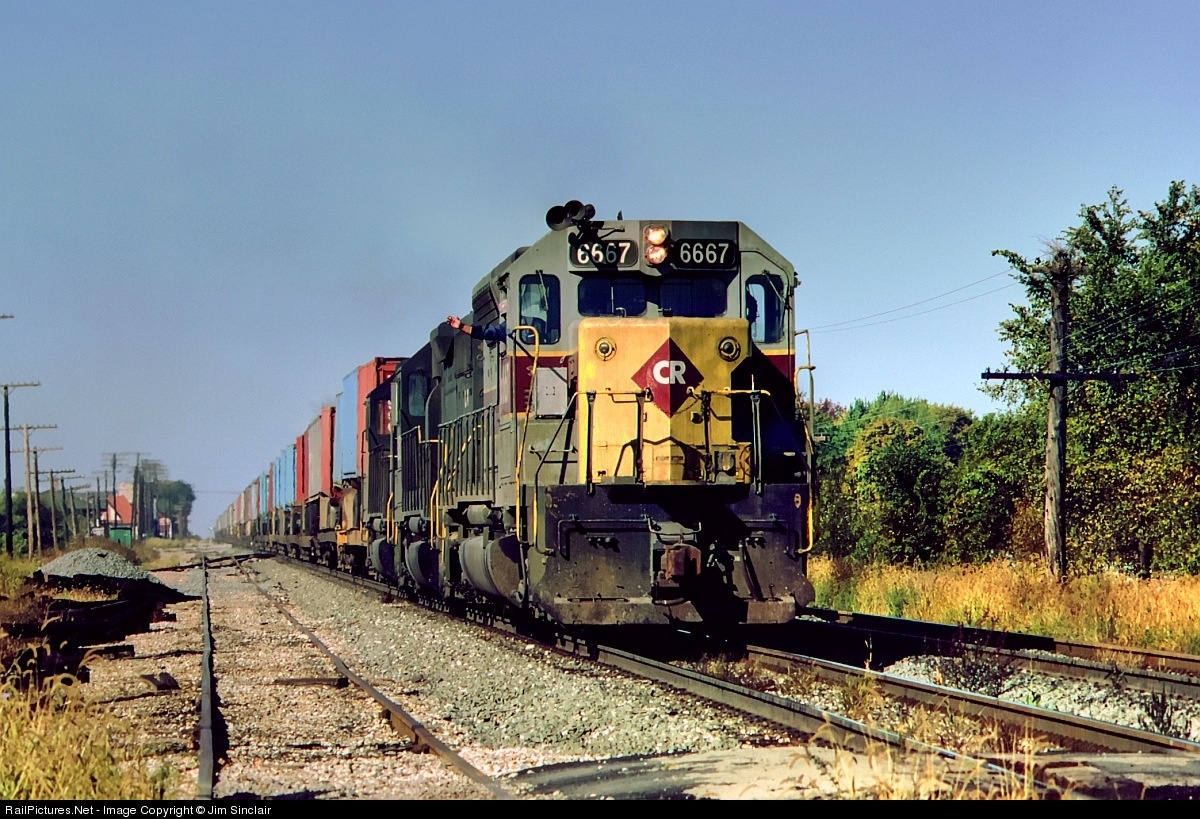 First and former Erie Lackawanna SDP45 3635, now wears a Conrail number and has received the hasty "CR" restenciling job that was so typical during this time period. Today's assignment is to lead a very fast eastbound Conrail TOFC train through St. Paris, Ohio, on a beautiful September morning. The hogger offers me a big wave and there's little doubt he's enjoying the smooth ride of recently refurbished track. Sadly, this former PRR main line was not part of Conrail's "final route plan" and was subsequently abandoned. The last time I passed through St. Paris a few years ago, the only remnants of this once proud main line were tall weeds and bits and pieces of the pole line that were never removed...