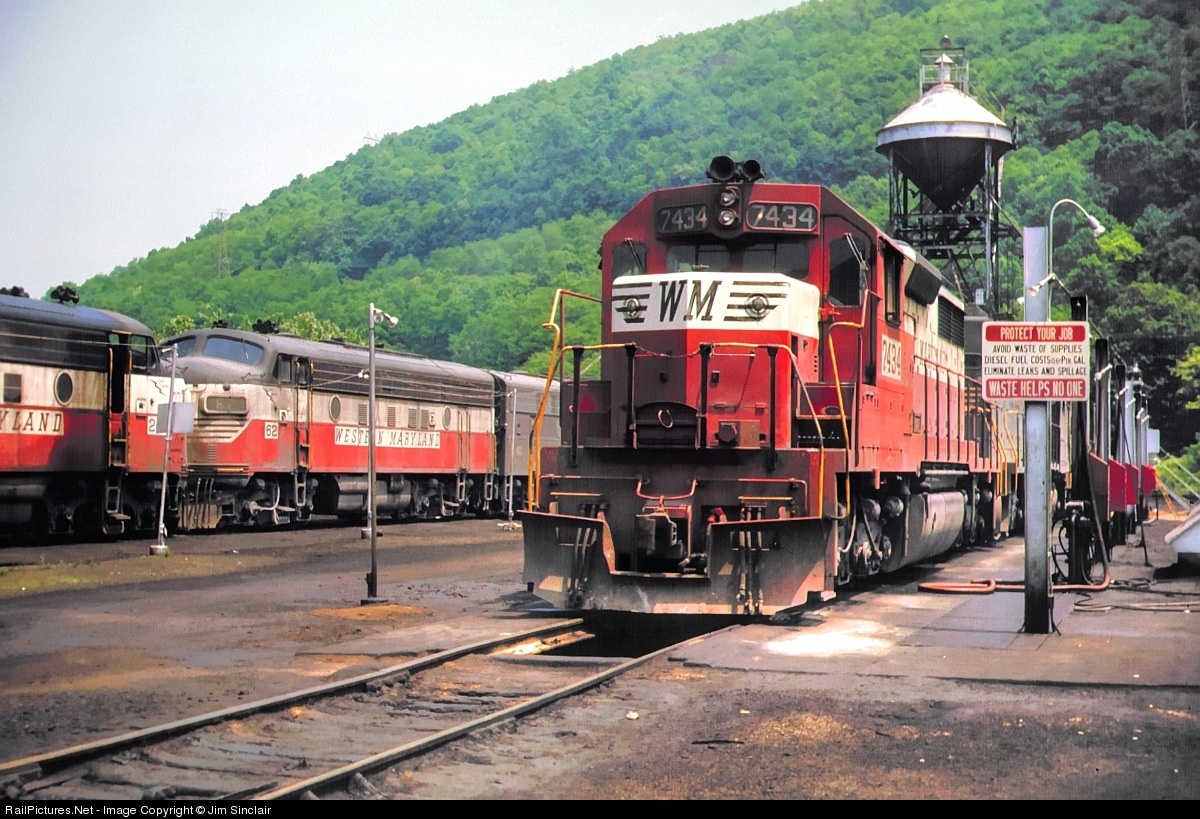 The 1975 Memorial Day holiday found me wandering around the Cumberland, Maryland area and searching for trains, but none were to found! I decided to cross the border and see what was happening over at the Western Maryland in Ridgeley. What I discovered was an engine terminal full of dead locomotives. I searched for someone who might grant me, at the very least, verbal permission to take some photos and much to my surprise, there wasn't one soul to be found! I parked my trusty old '68 Dodge Dart in a safe place, grabbed my Argus C3 and had a field day "memorializing" WM power at the Ridgeley engine facility. Just in case anyone is wondering what the price of diesel fuel is on the sign immediately to the right of 7434, it reads 10.6 cents per gallon! I never could find the average price of diesel fuel in 1975, but remembering how much gasoline increased in the mid '70s, I think it's safe to say the sign was a tad bit out of date...