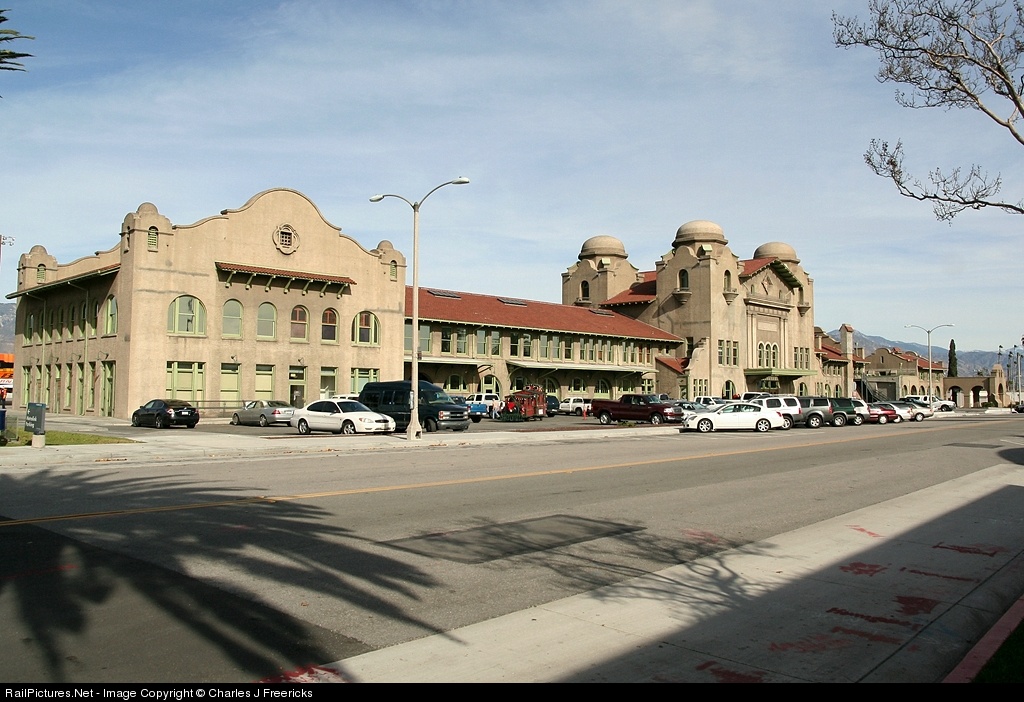 This is the street view of Santa Fe's grand Mission Revival and Moorish styled San Bernardino station. When opened in July of 1918 it was reported to be the largest train station west of the Mississippi River. Today, the building is used as both a small railroad museum and as offices for the San Bernardino Associated Governments (SANBAG). Amtrak still stops at the platform in front, but Metrolink trains stop to the west of the station at new platforms built just for them.