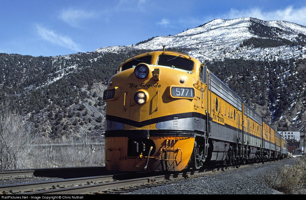 After a light sprinkling of overnight snow on the mountain tops, the westbound RGZ departs Glenwood Springs behind the usual suspects on a glorious March day in 1982.