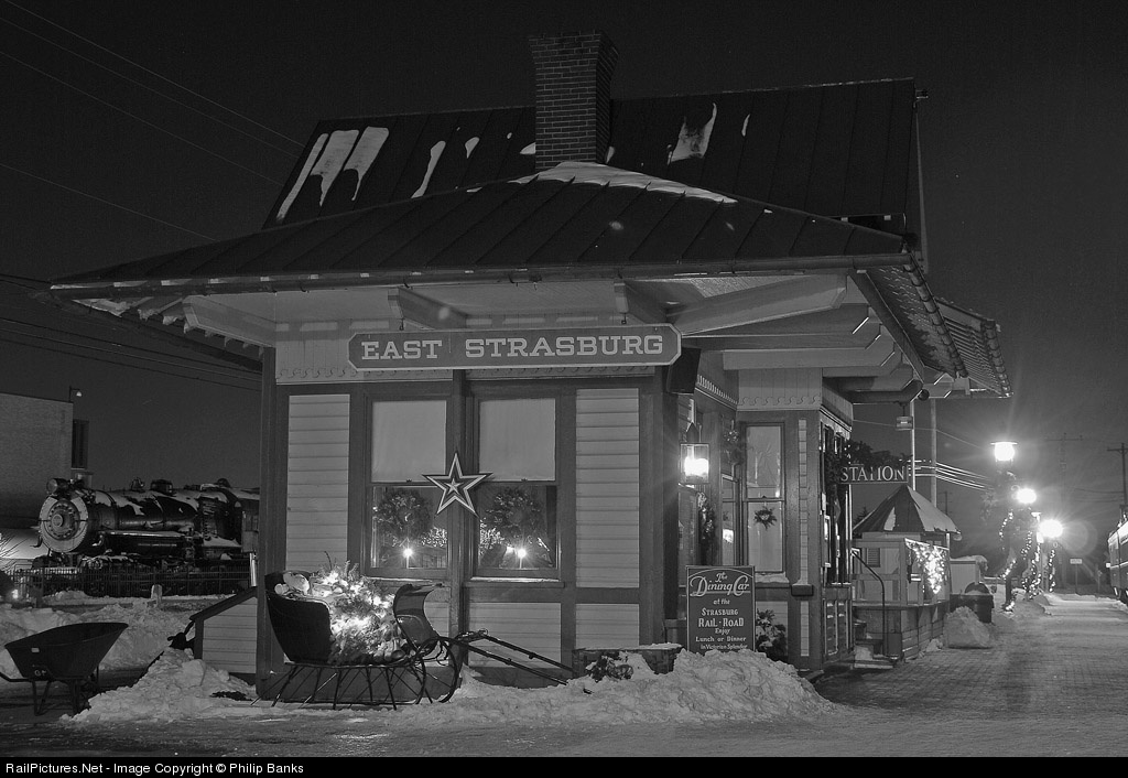 The now quiet station of East Strasburg sits closed up for the nigth on this cold wintery scene on the day after the Noreaster which left 12+ inches of snow. It's a nightly view of the station closed up after the last day of Santa Claus Runs for the Strasburg Railroad. Notice PRR #7688 sits over at the Railroad Museum of PA looking on!