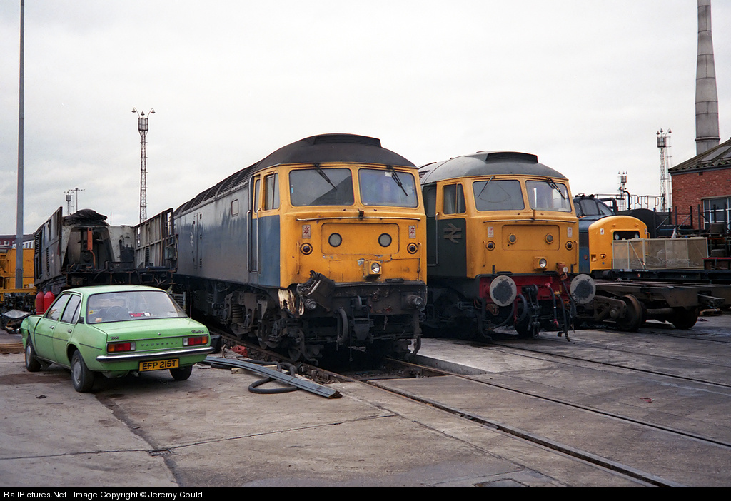 | A crash damaged and withdrawn 47113 stands outside Stratford TRS next to sister 47500 'GREAT WESTERN'. Of note are the remains of a Class 31 and also a tastefully coloured Vauxhall Cavalier. |