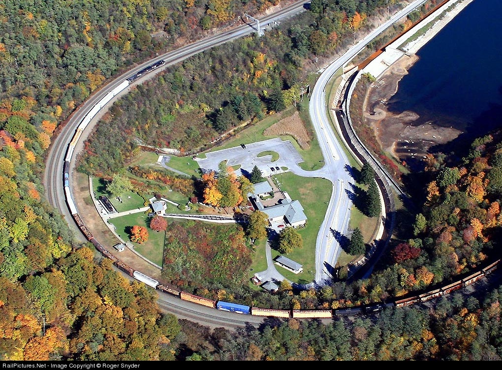 It's a perfectly gorgeous day high above the NS Horseshoe Curve as an eastbound manifest eases down the mountain towards Altoona. The Horseshoe Curve National Historic Landmark lies in the center of the curve.