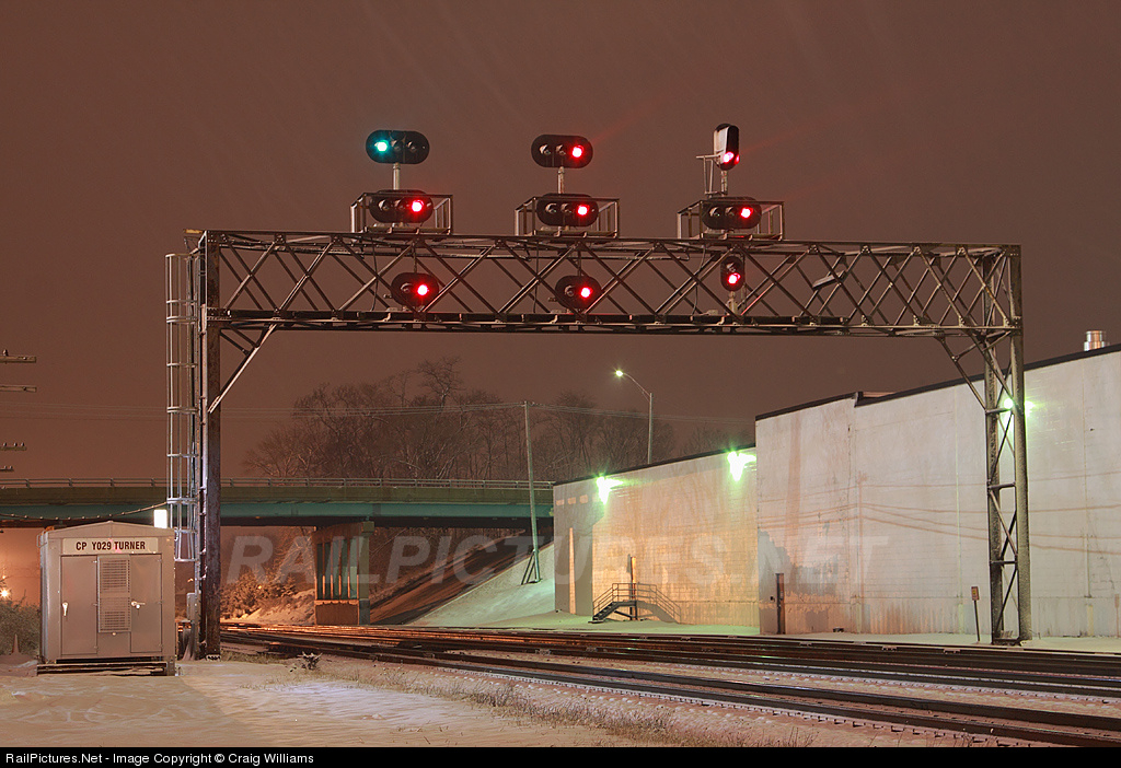 Snow falls on a Chicago evening as trains roll east and west on the busy UP East-West mainline out of Chicago. Here at Turner the unusual horizontal signals are getting a touched caked with snow.