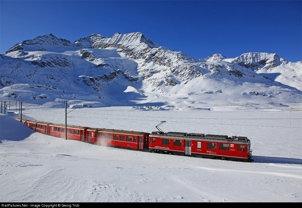 | ABe 4/4 54 with name of Hakone and the japanese flag (the Hakone Tozan Railway is partner of the RhB) is pulling train 1640 Tirano-St.Moritz along the ice and snow covered Lago Bianco (White Lake), in the background Piz Cambrena (3602 metre, in the middle). In front of the cars you can see snow which was whirled up by the plow of the motorcar. |