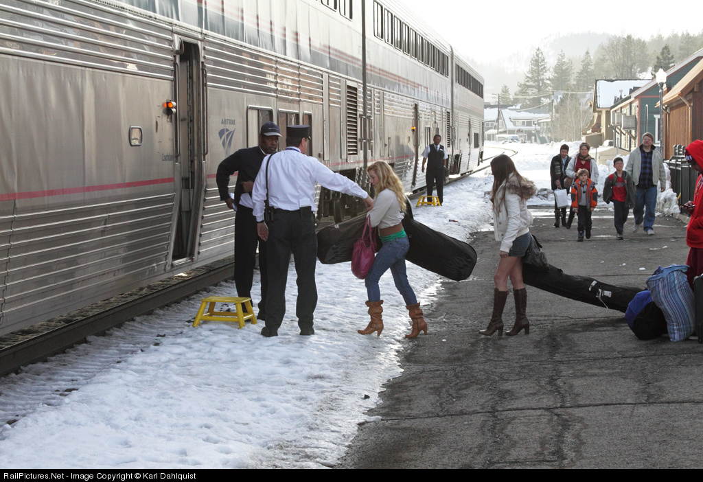 | These passengers seem to have been caught off-guard by climate change as several Amtrak on-board personnel go all out to assist them in loading their ski equipment onto the eastbound California Zephyr. Truckee is a very popular winter destination for snowboarders, skiiers and others who partake in winter sports activities. |