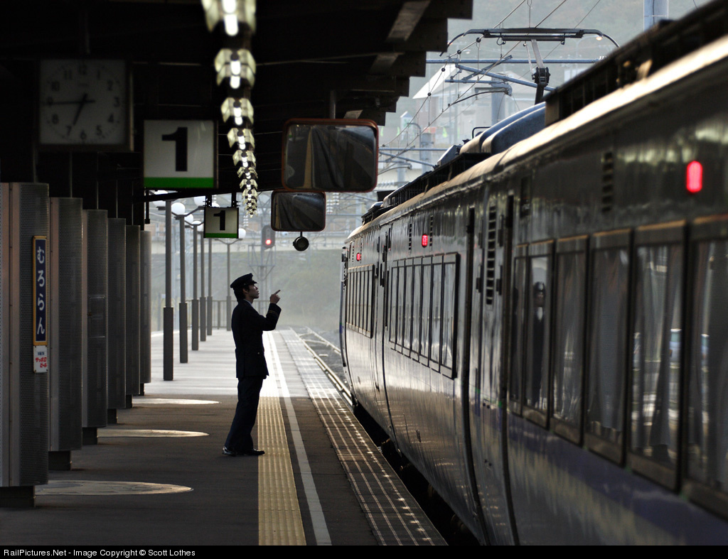 Station agent at Muroran, Hokkaido, Japan, checking the equipment of Suzuran train no. 1, the first express of the day for Sapporo, just before its 6:49 a.m. departure. JR Hokkaido operates five pairs of Suzuran trains daily between Muroran and Sapporo. The equipment in the photo is a 781-series EMU from 1979, although these runs have since been upgraded to the newer 785-series.