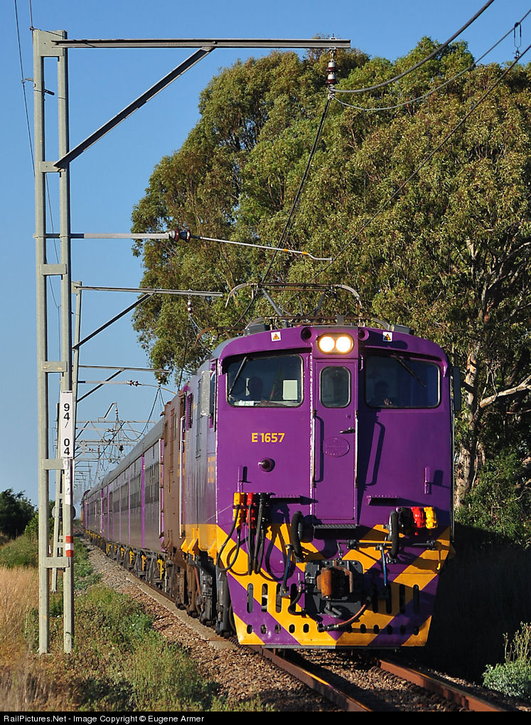 Newly outshopped 6E1 E1657 in purple "Shosholoza Meyl" livery leads the Johannesburg - Cape Town "Premier Classe" south of Boskop, heading towards Potchefstroom.