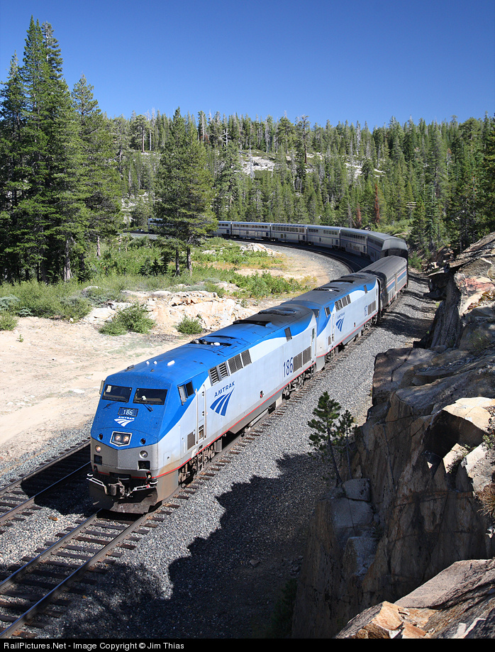 | "It's all downhill from here!" After its long journey across the Great Plains and two mountain ranges, California Zephyr #5 is on the final leg of its trip en route to the San Francisco Bay area. Here we see 186 & 162 leading their train as it effortlessly glides around the big curve at Troy on the west slope of Donner Pass. |